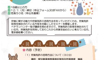 愛知県猟友会は、昭和4年9月に発足して以来、野生鳥獣の保護管理を始め、狩猟事故・違反の防止対策、有害鳥獣の駆除などの社会貢献活動に積極的に取り組んでおりますが、近年、イノシシやクマが市街地へ出没し人的被害が多発する等、猟友会を取巻く狩猟環境は大きく変化しています。 私ども猟友会は、自然との共生を図りながら、狩猟技術の向上や狩猟事故・違反の防止等、今後とも狩猟の適正化に取り組んでまいります。 狩猟に興味のある方々の加入を心よりお待ちしております。