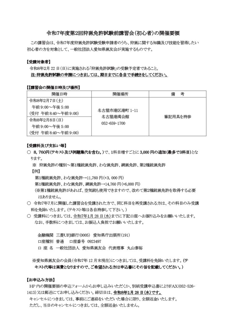令和7年度第2回狩猟免許試験前講習会 お知らせ!!「令和7年度 第2回狩猟免許試験前講習会(初心者)の開催要領」を掲載しました。 お申し込みはこちら google formが開きます FAXの方はこちらからダウンロード(PDF)してください。